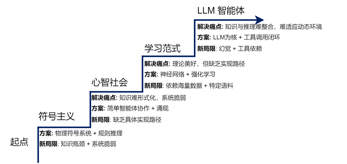 如图2.1所示,每一个新范式的出现,都是为了解决上一代范式的核心“痛点”或根本局限。 而新的解决方案在带来能力飞跃的同时,也引入了新的、在当时难以克服的“局限”,而这又为下一代范式的诞生埋下了伏笔。理解这一“问题驱动”的迭代历程,能帮助我们更深刻地把握现代智能体技术选型背后的深层原因与历史必然性。